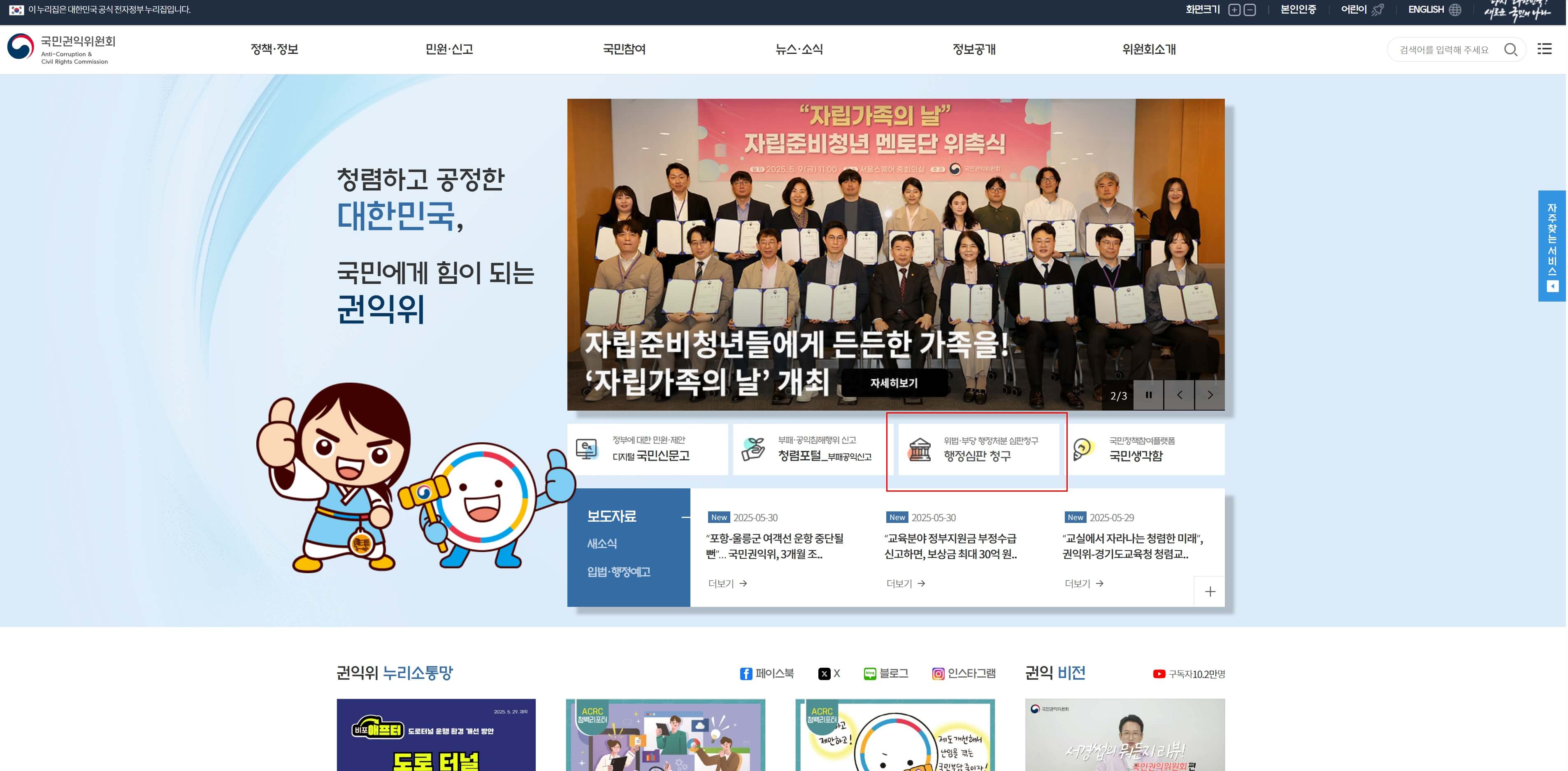 - 국민권익위원회 홈페이지 경유: 국민권익위원회 공식 홈페이지(www.acrc.go.kr)를 통해서도 관련 메뉴나 배너를 통해 접속할 수 있습니다.